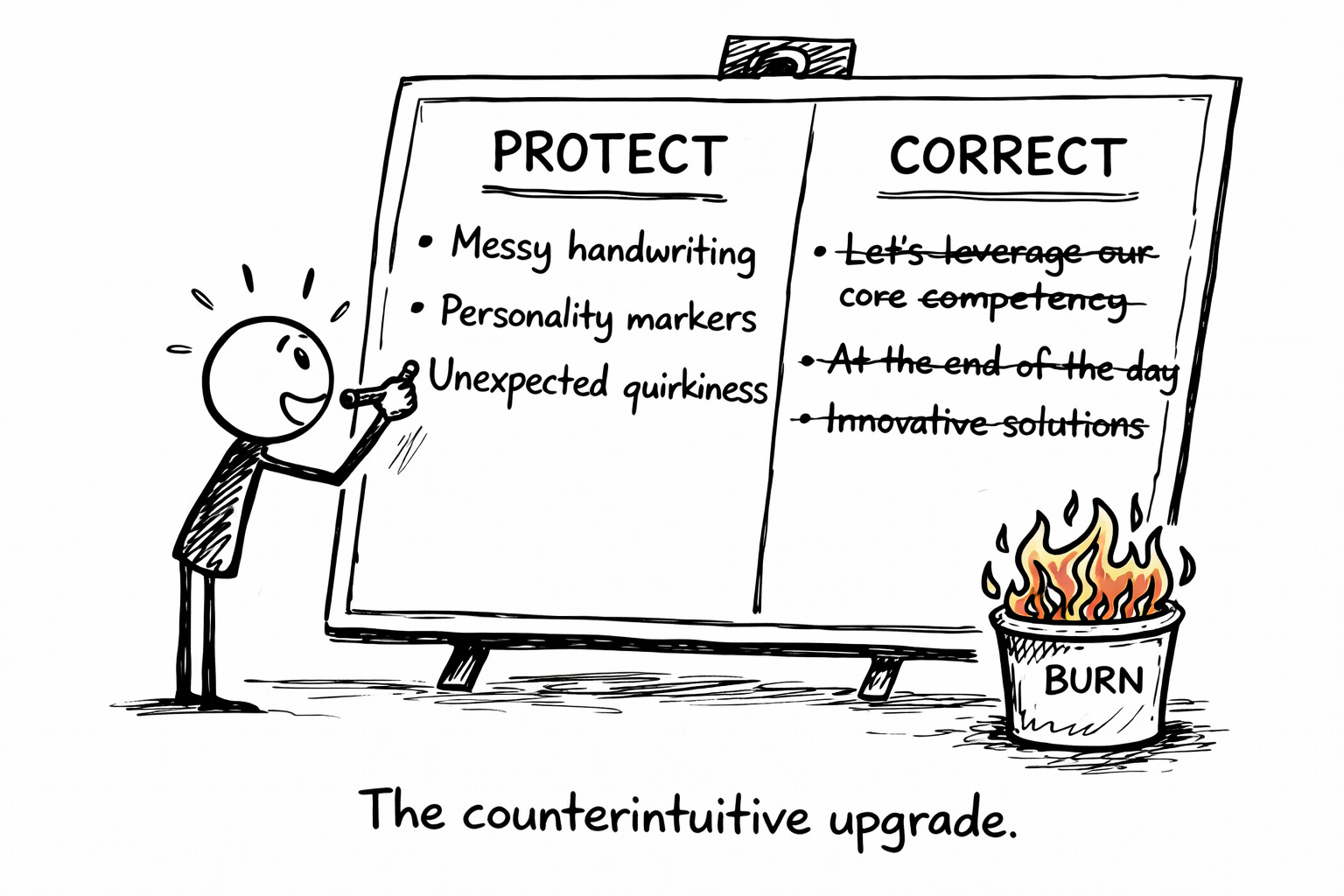 Every time you fixed something AI produced. Every time you added “too formal” or “make it punchier” or “this sounds like a robot learned English from insurance policy documents.” (That last one might just be me.)