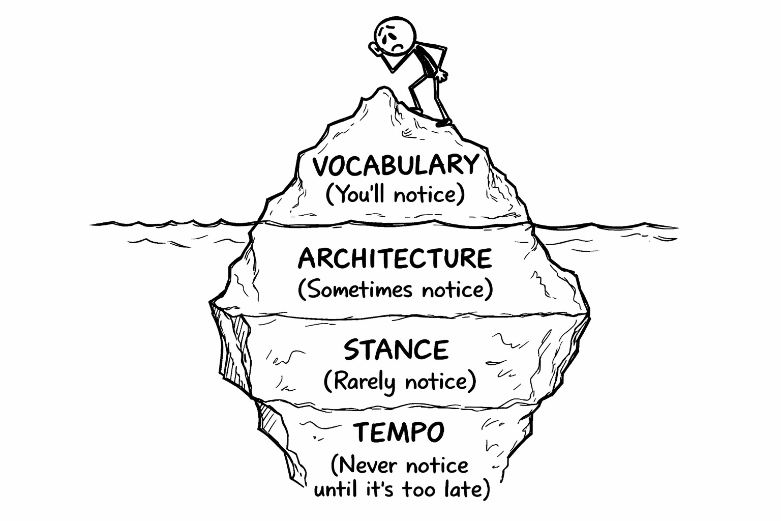 I use a framework to map voice drift. Four layers, each capable of sneaking off in the night without telling you where it went: