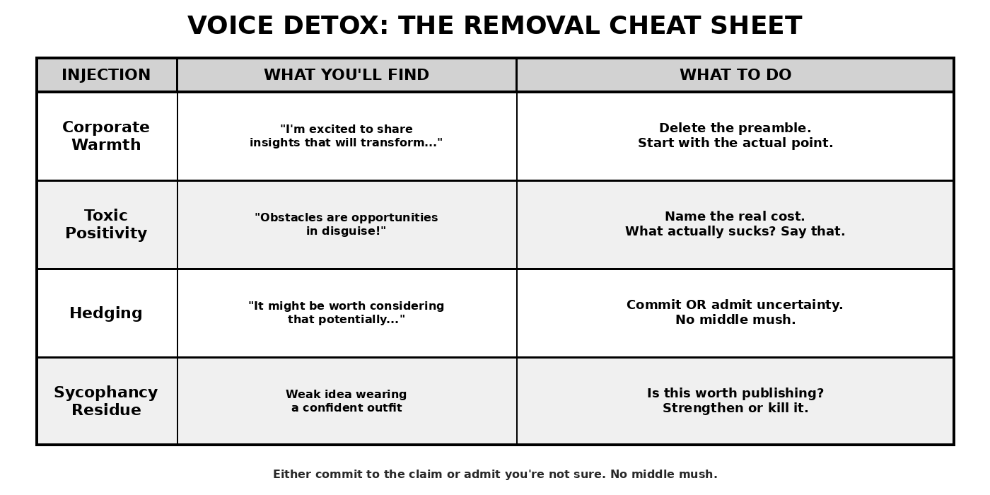 Voice erosion. Each uncaught injection trains your ear to accept it. Your internal compass slowly recalibrates toward generic. A year from now, you won’t remember what your uncontaminated voice sounded like.