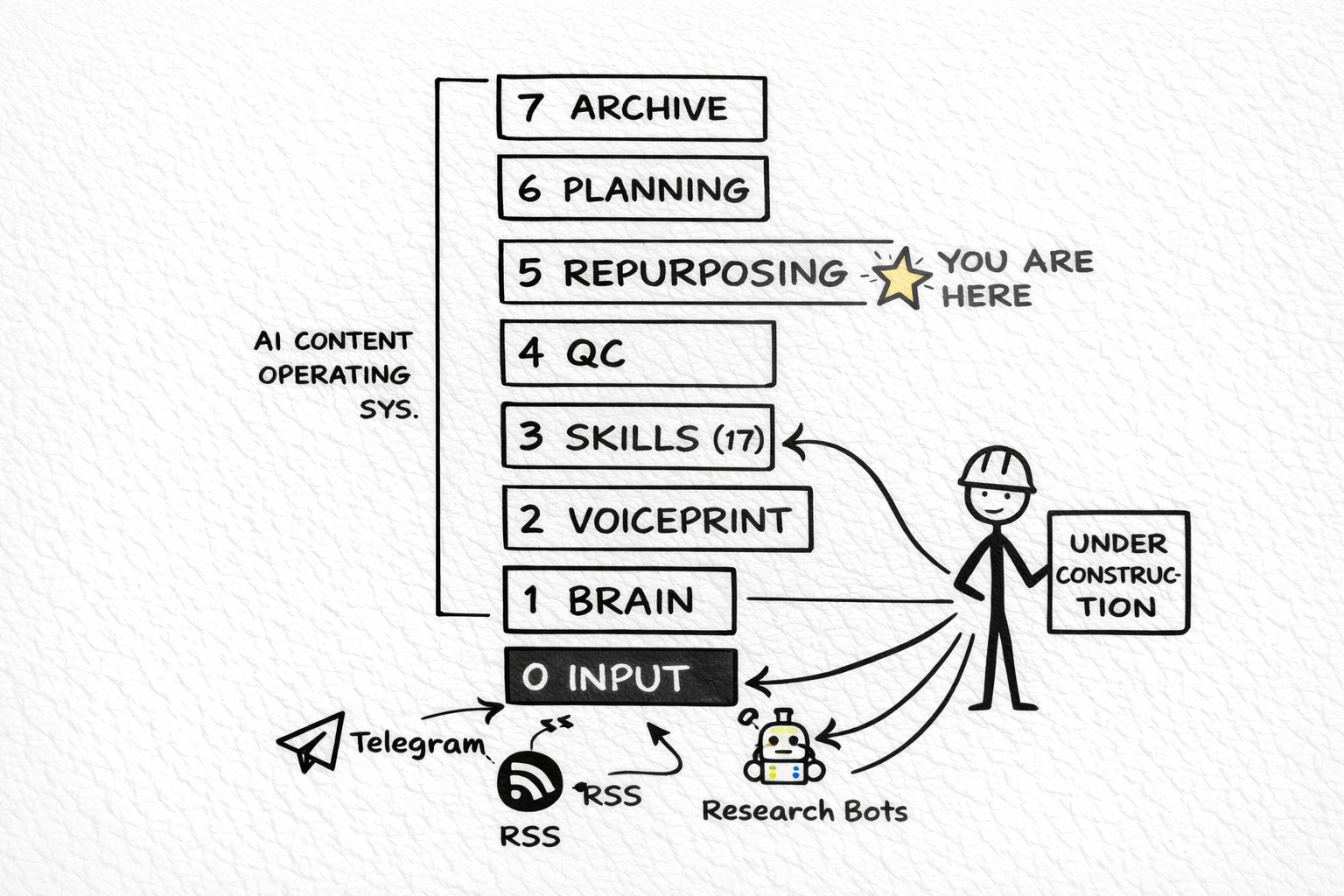 Layer 0: Input Capture. Ideas flow in from Telegram (quick voice memos and links I send myself throughout the day), RSS feeds (curated industry sources), and research bots (including Momo, my AI news scanner that produces daily scored briefs). This is the raw material pipeline. Nothing gets created from nothing.