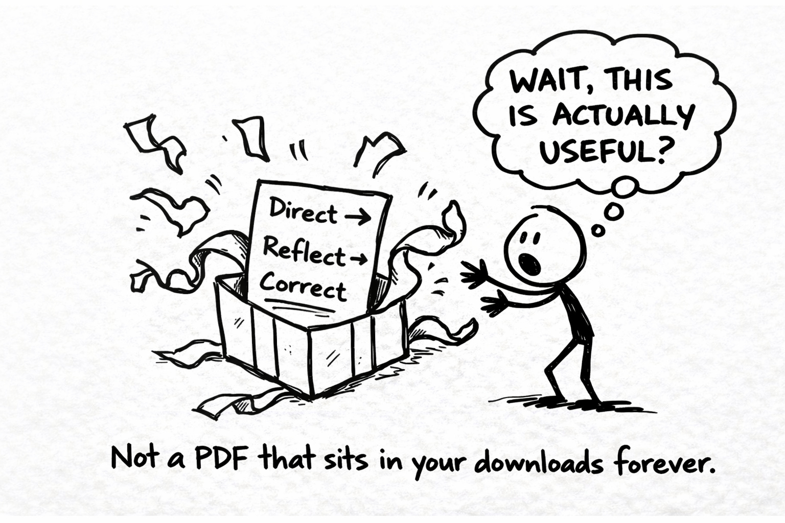 The Direct → Reflect → Correct loop explained. Not theory. The exact process for calibrating AI to your voice in three rounds or less. Each round gets more precise. By round three, the output is yours.