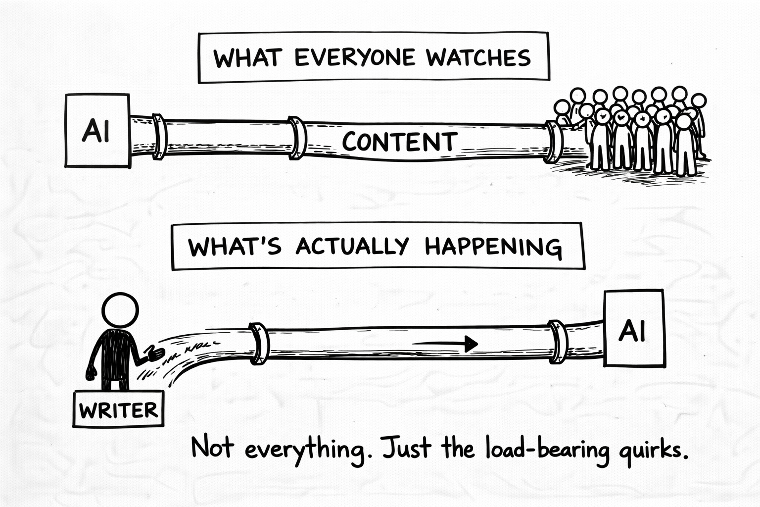 Your weird sentence structures are disappearing. The asides that let readers hear you thinking. The run-ons that earned their length through sheer audacity. The grammar crimes committed in service of rhythm.