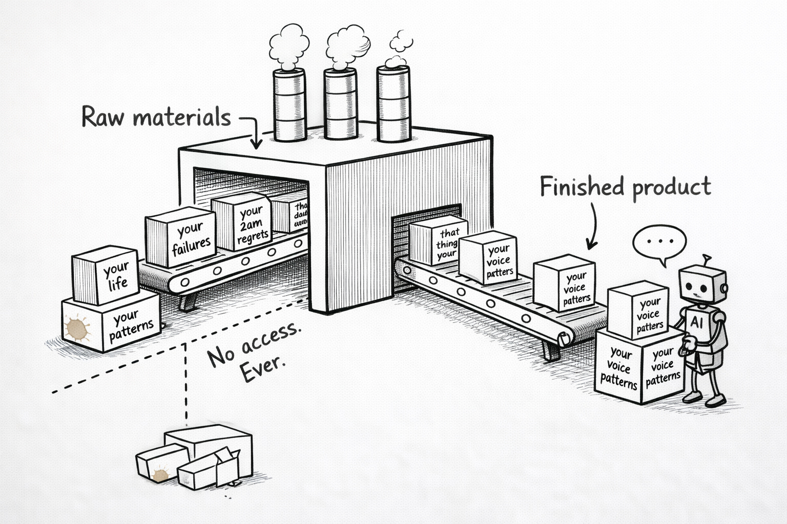 The better your Voiceprint, the less AI needs you specifically. You’ve written the recipe for your own voice. Once the recipe exists, anyone can cook. Anything can cook.