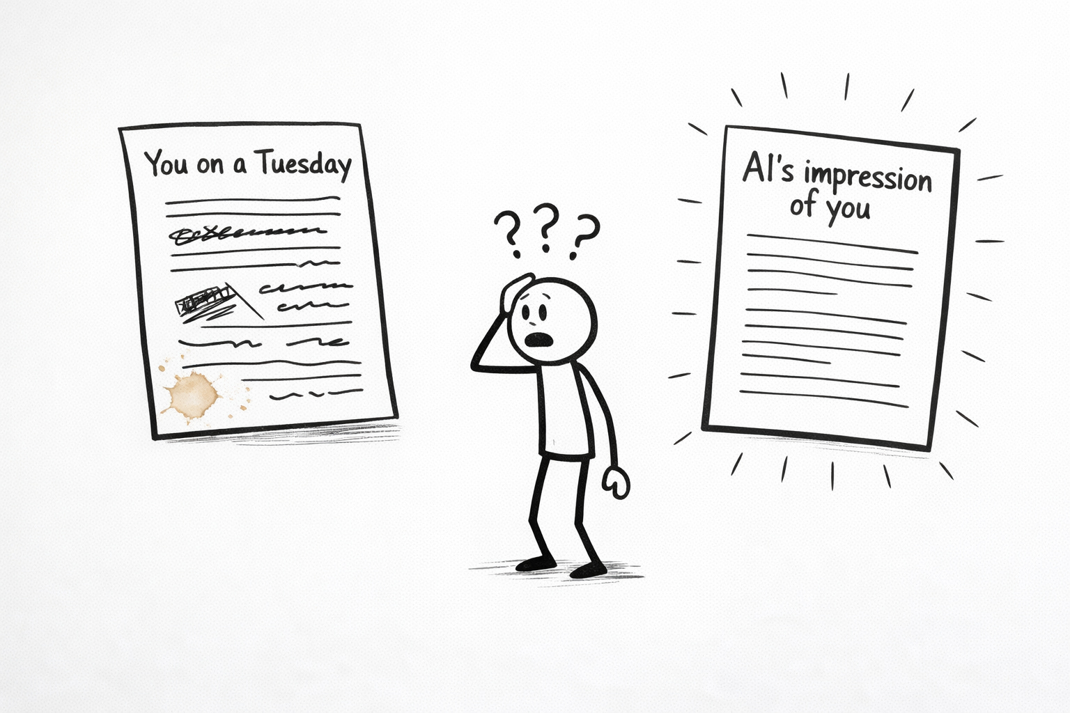 Your voice, but better. Your patterns, but consistent. Like hiring a ghostwriter who somehow knows you better than you know yourself but never needs to sleep or eat or spiral about their career choices at 2am.