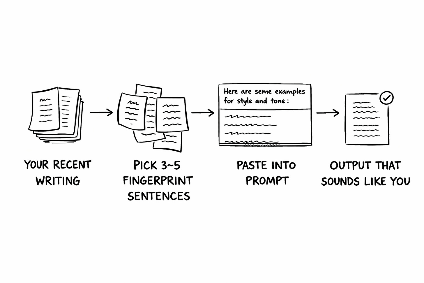 You find 3-5 sentences you’ve already written—ones with your fingerprints baked into the structure—and paste them directly into the prompt.