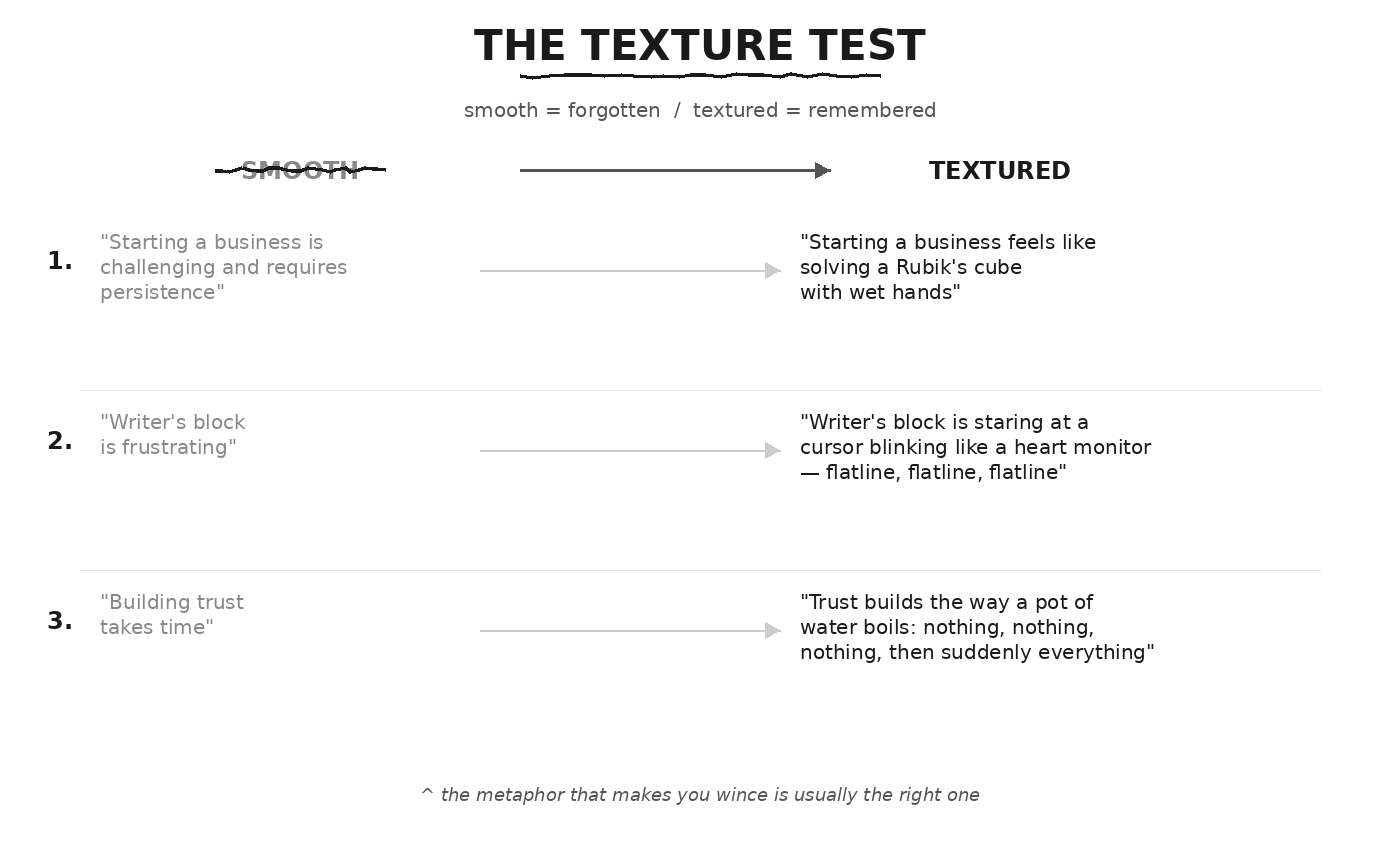 That slight discomfort? That’s the texture. The metaphor that makes you wince a little is usually the right one.
