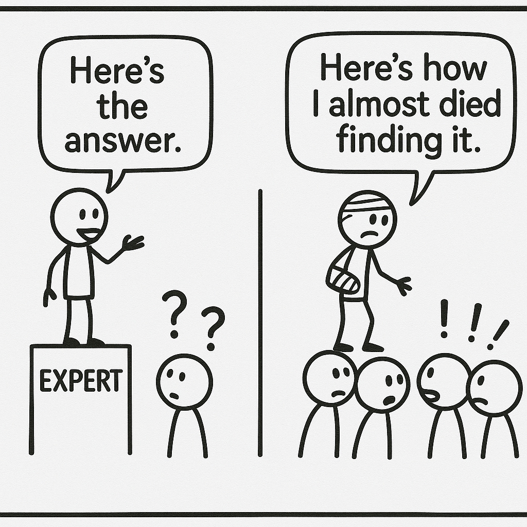 Not just: “Here’s what works.” But: “Here’s what I tried that didn’t work, what it cost me, and what I finally learned after faceplanting repeatedly.”