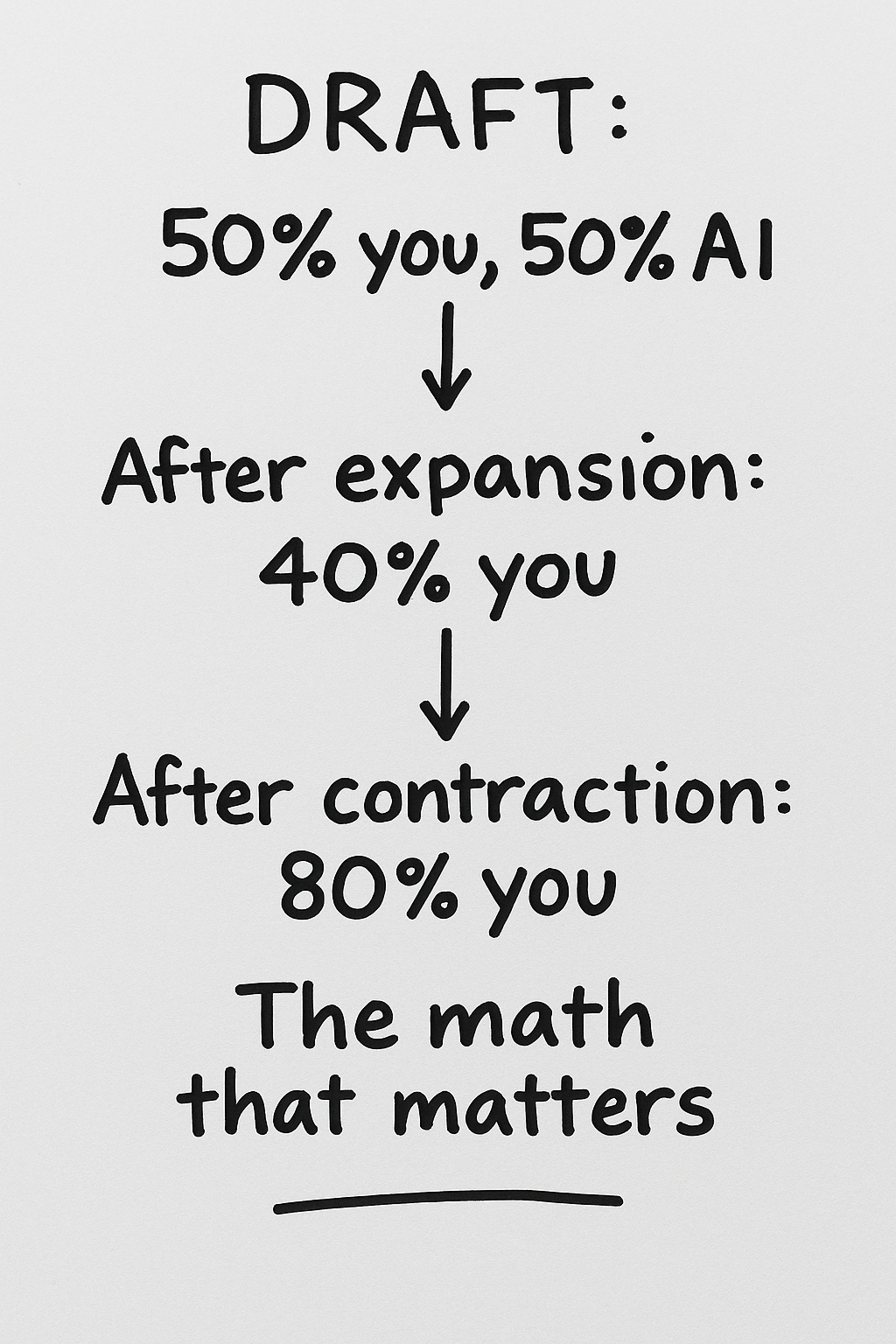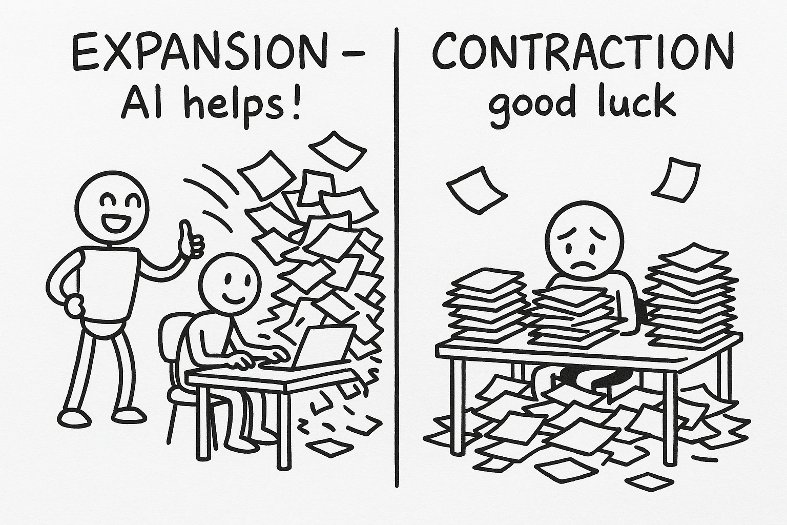 Which creates a lopsided workflow: AI expands. You contract. Alone. At midnight. Running on coffee and spite.