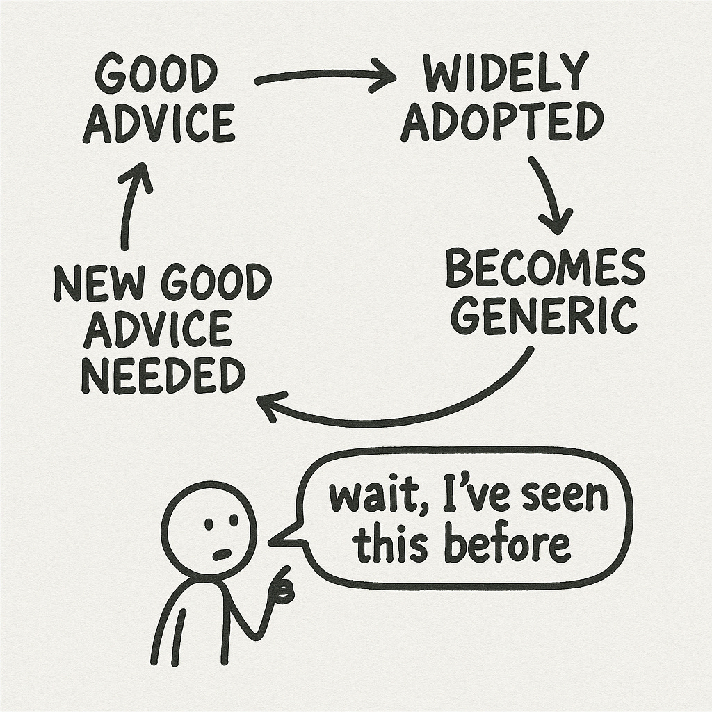 The technique stops working. Not because it was bad advice. Because it was good advice that too many people followed. The output becomes recognizable. The “trick” becomes a tell. What used to sound fresh now sounds like everyone else who read the same thread.