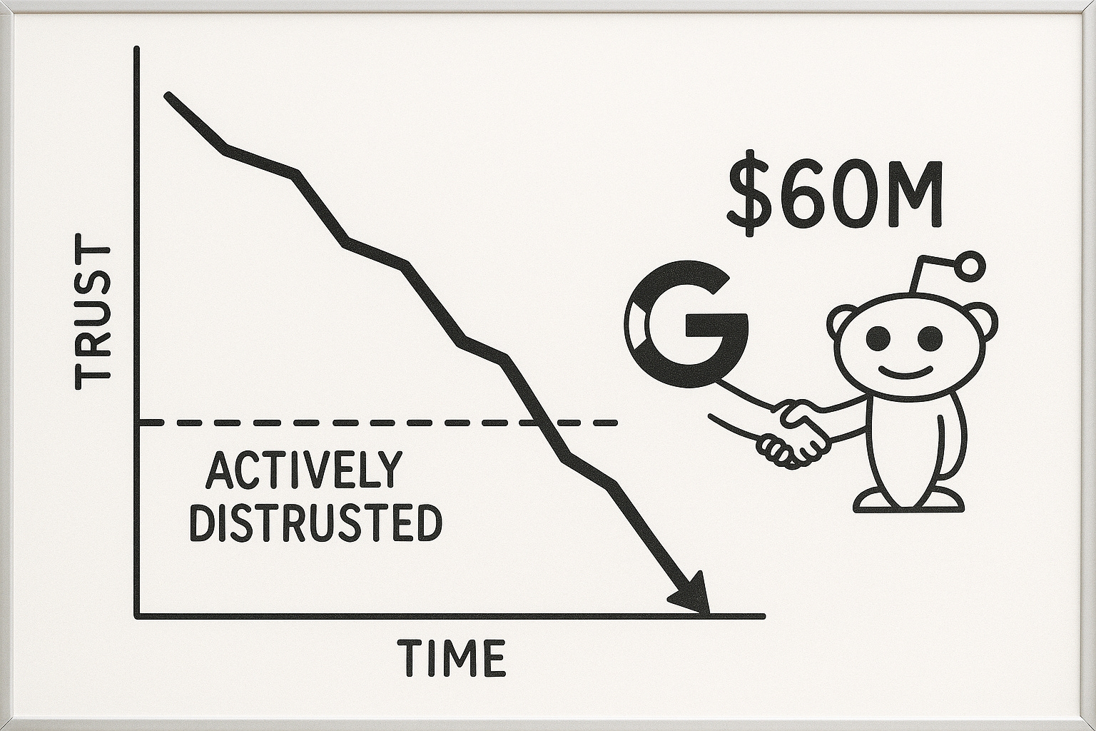 The Reddit appendage (1,328% SEO growth) proves audiences are hacking their own search behavior. Adding “reddit” to Google searches because they trust anonymous strangers more than Google’s results.
