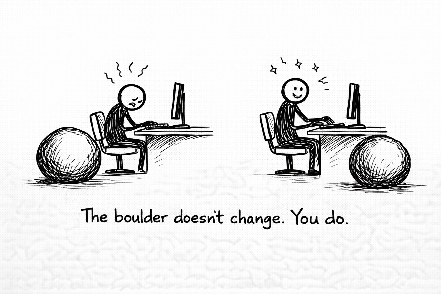 Not because the boulder stops rolling. It never stops. Not because the gods relent. They don’t. Not because he finds a productivity hack that makes the boulder 10% lighter or rolls it up a slightly shorter hill. The boulder weighs what it weighs. The hill is the hill. The situation never improves.