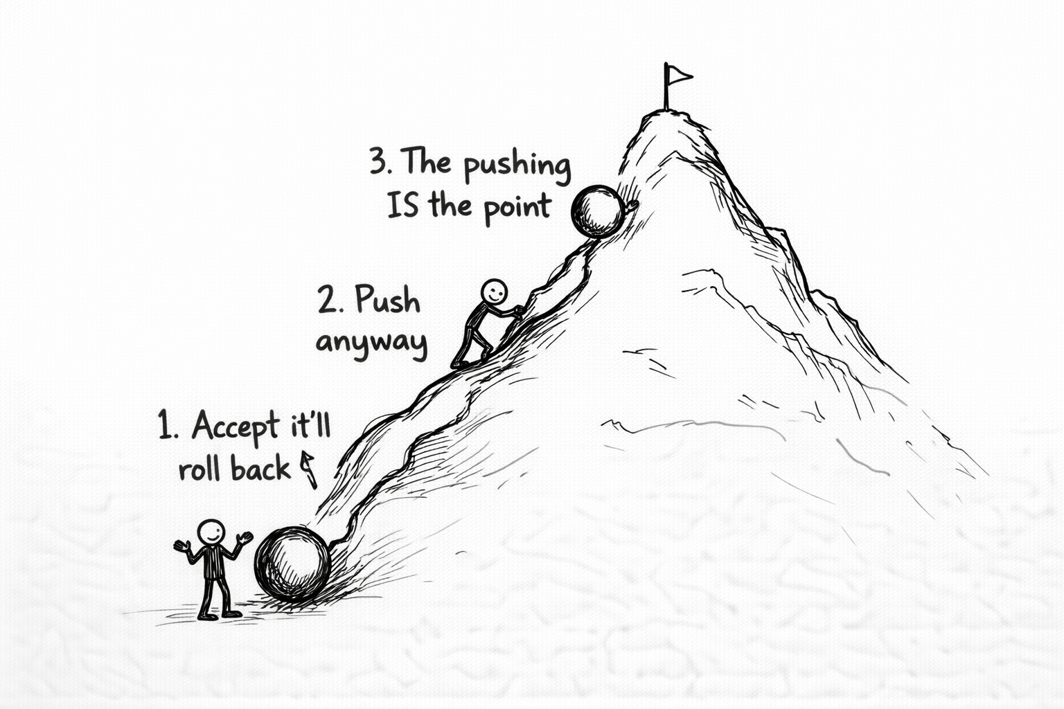 The point isn’t optimization. The point is that the pushing itself becomes meaningful. Not because the boulder stays at the top. It never stays. But because you chose to engage. Because you decided this task matters to you. Because you made the absurd situation yours.