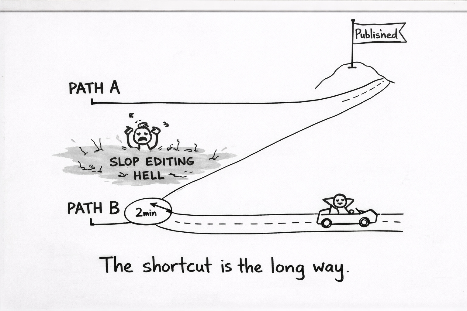 They treat the editing time as fixed. Immutable. A law of nature, like gravity or the fact that your backup plan has quietly become your actual life. “That’s just what working with AI takes.”