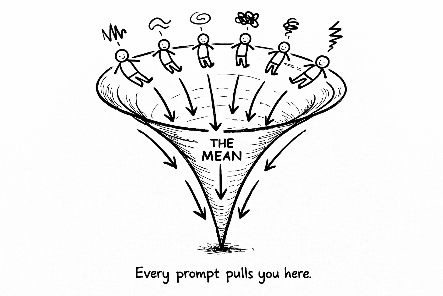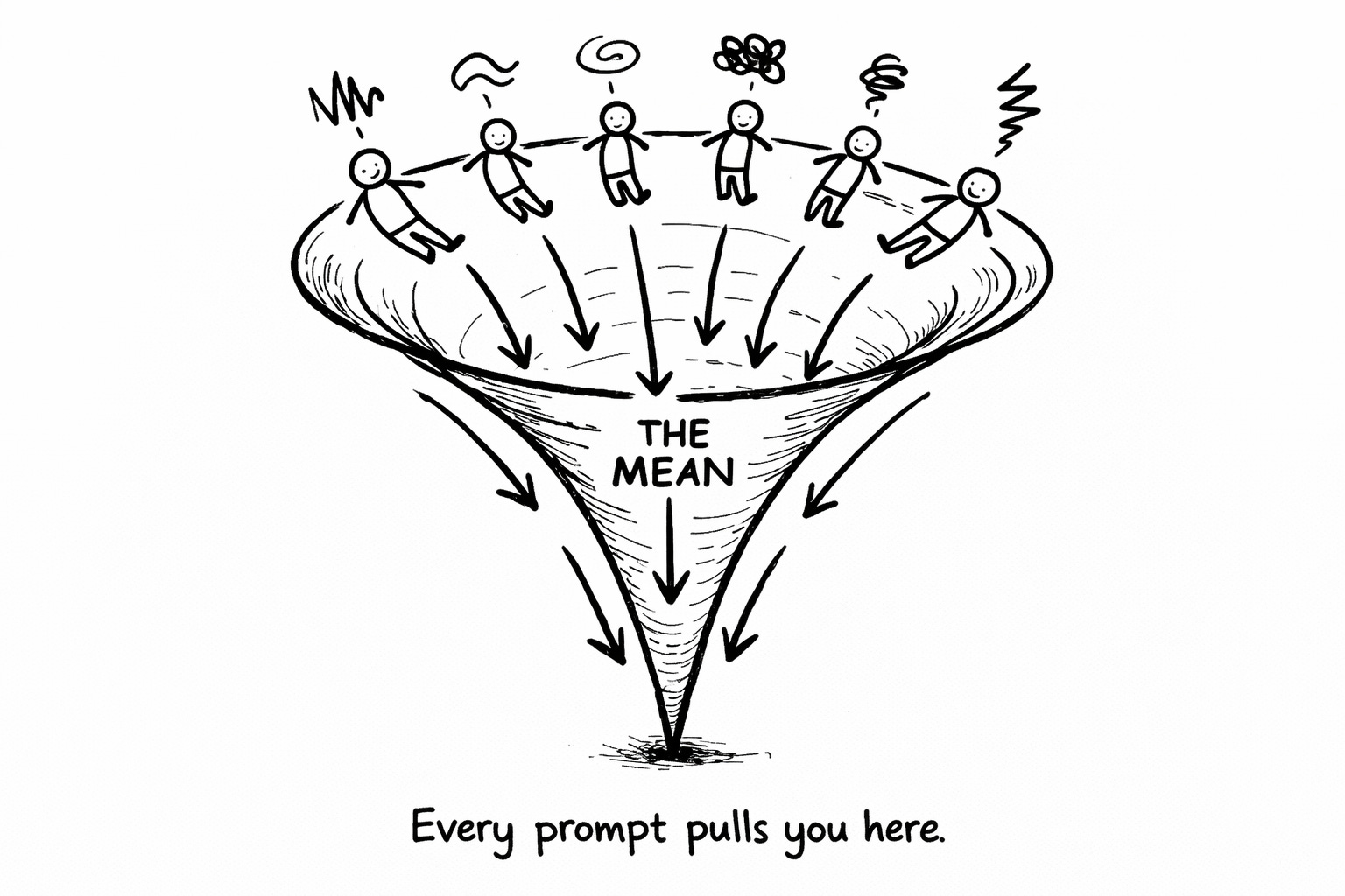 The model doesn’t have YOUR patterns stored anywhere. It has the average of everyone’s patterns. No prompt—no matter how sophisticated, how cleverly structured, how many “act as a world-class copywriter with 20 years of experience” prefixes you stack—can extract patterns that don’t exist.