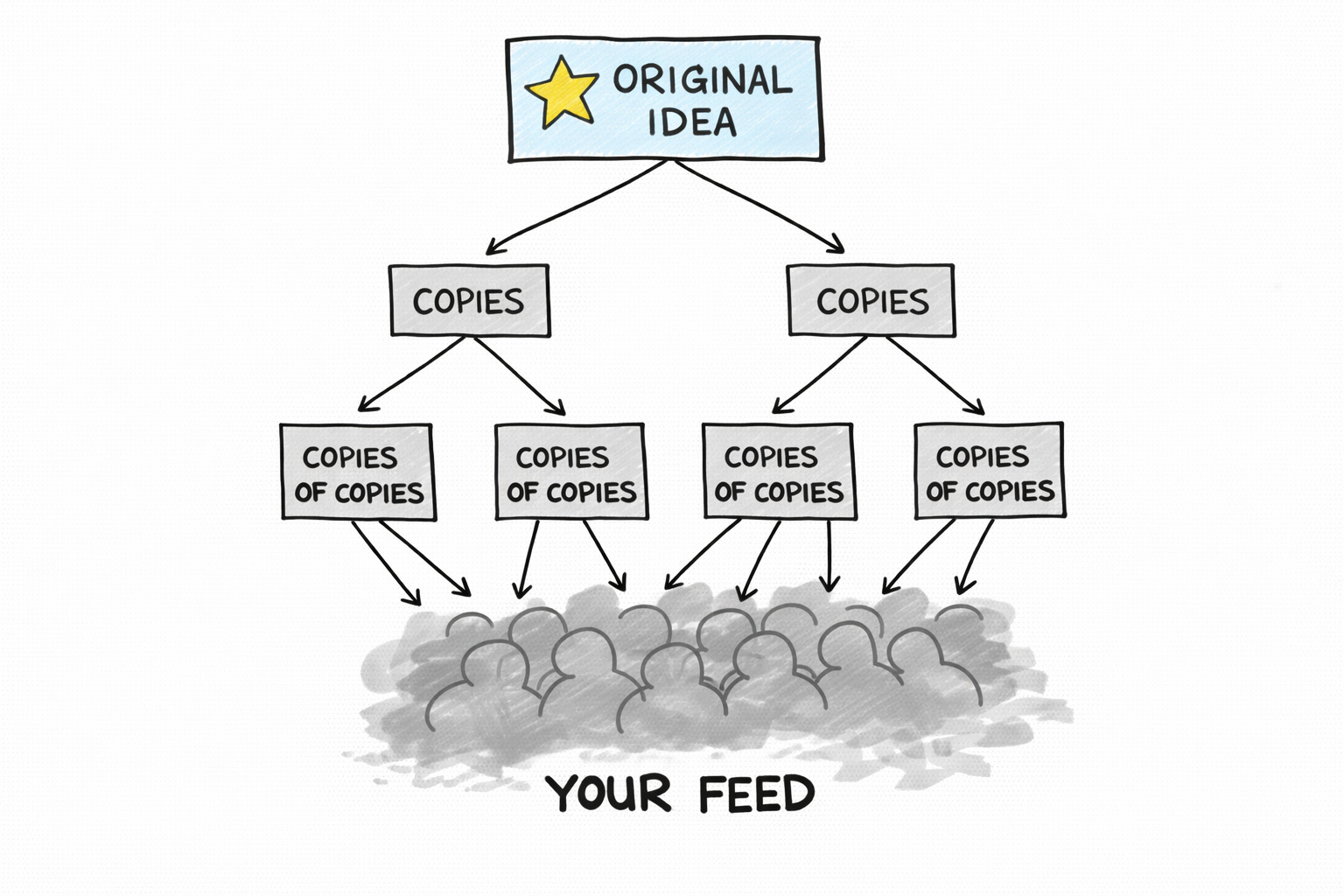 Someone succeeds with a format. The format gets noticed. It gets copied. The copies get copied. Six months later, your entire feed is variations of the same template, and the format that once stood out now disappears into the noise.