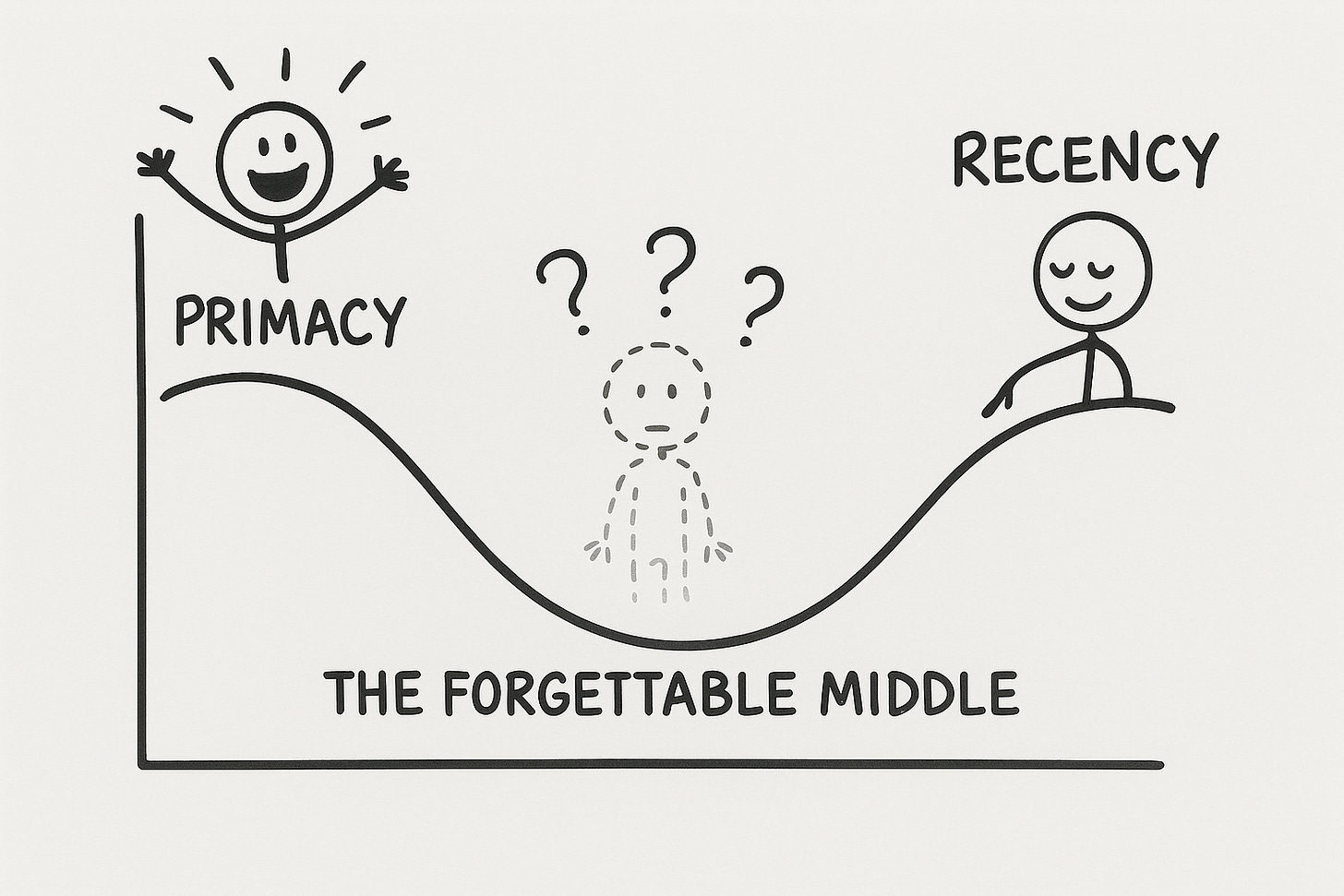 The serial position effect is a fancy way of saying: humans remember the first things in a sequence and the last things in a sequence. Everything in the middle gets tossed into the cognitive equivalent of a junk drawer.