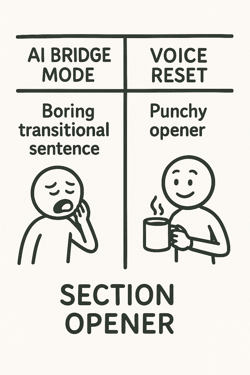 A section opener that sounds like bridging language (”Now let’s examine the next crucial element...”) breaks the voice contract. Not dramatically. But enough to create a subtle sense that someone swapped writers mid-piece.