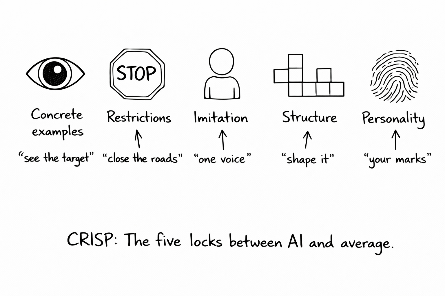 C.R.I.S.P. stands for five types of instructions that force AI off the average and onto YOUR specific patterns: