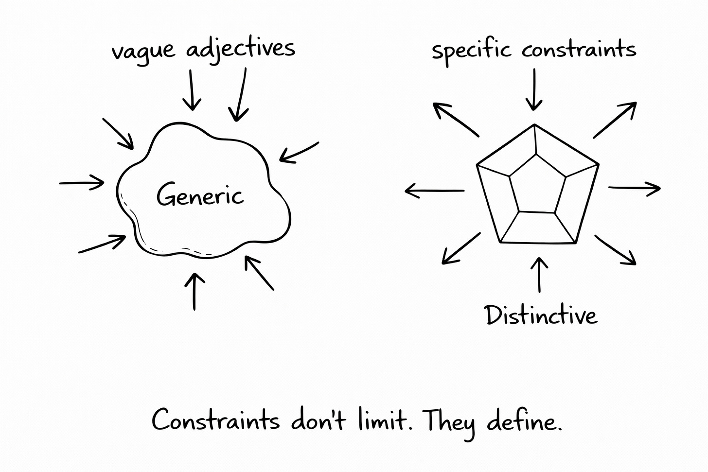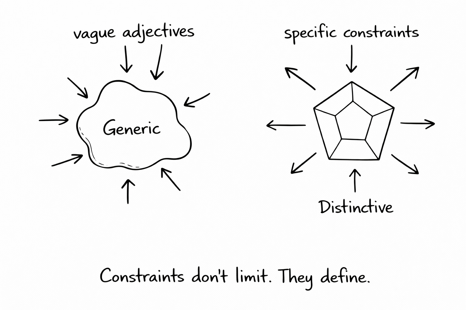 This sounds backwards, like trying to sculpt by describing which marble to leave. But restrictions are the fastest path to originality. When you ban the obvious choices, AI is forced to find alternatives. It has to diverge from the average because you’ve blocked the average. You’ve put up roadblocks on all the highways to Mediocrity City.