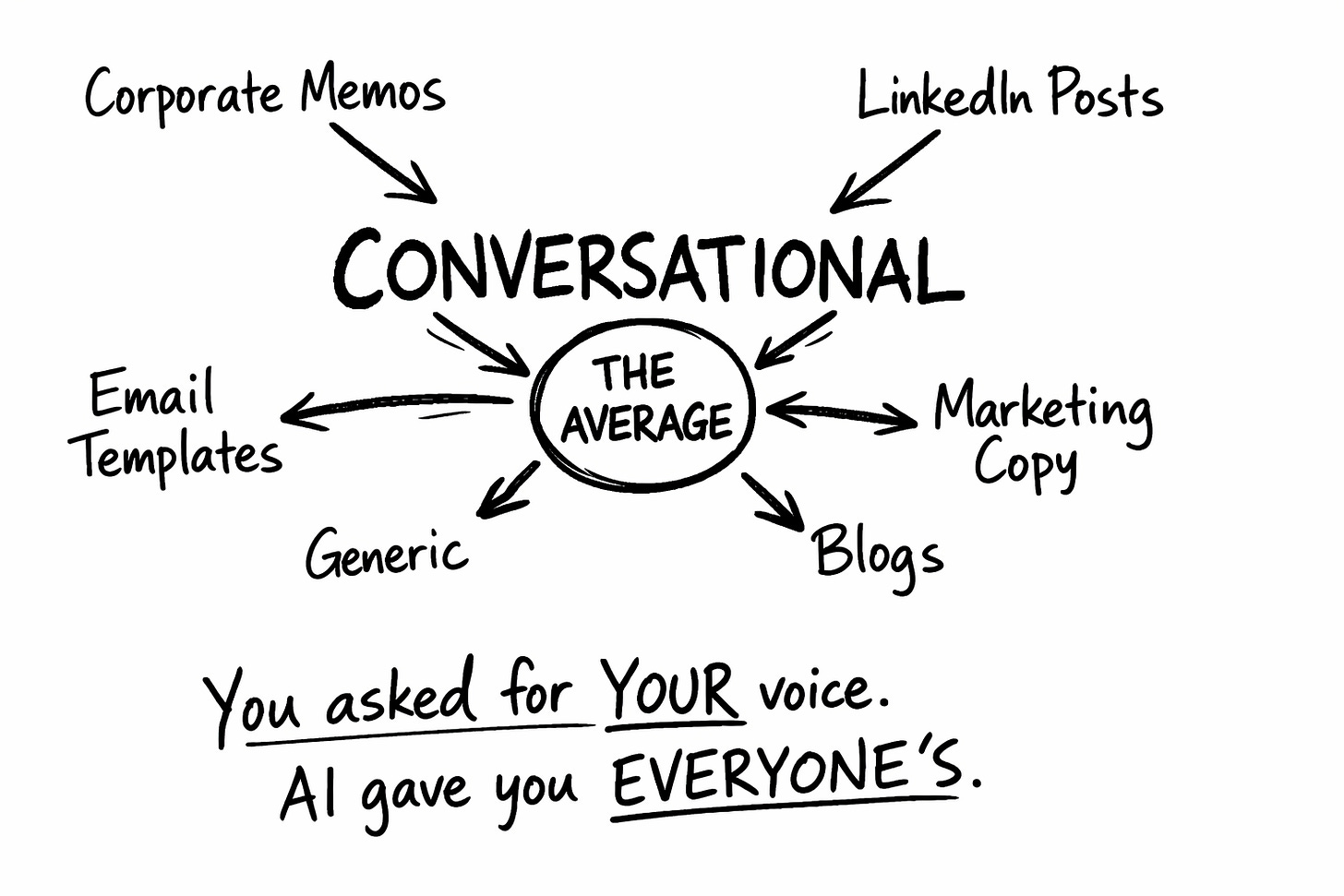 When you ask for “conversational,” you’re not asking for YOUR conversational. You’re asking for the statistical mean of every conversation ever written. Every corporate memo that tried too hard. Every LinkedIn post that opened with “I’m proud to humbly announce.” Every thought leadership piece written by someone who uses “paradigm shift” without irony.