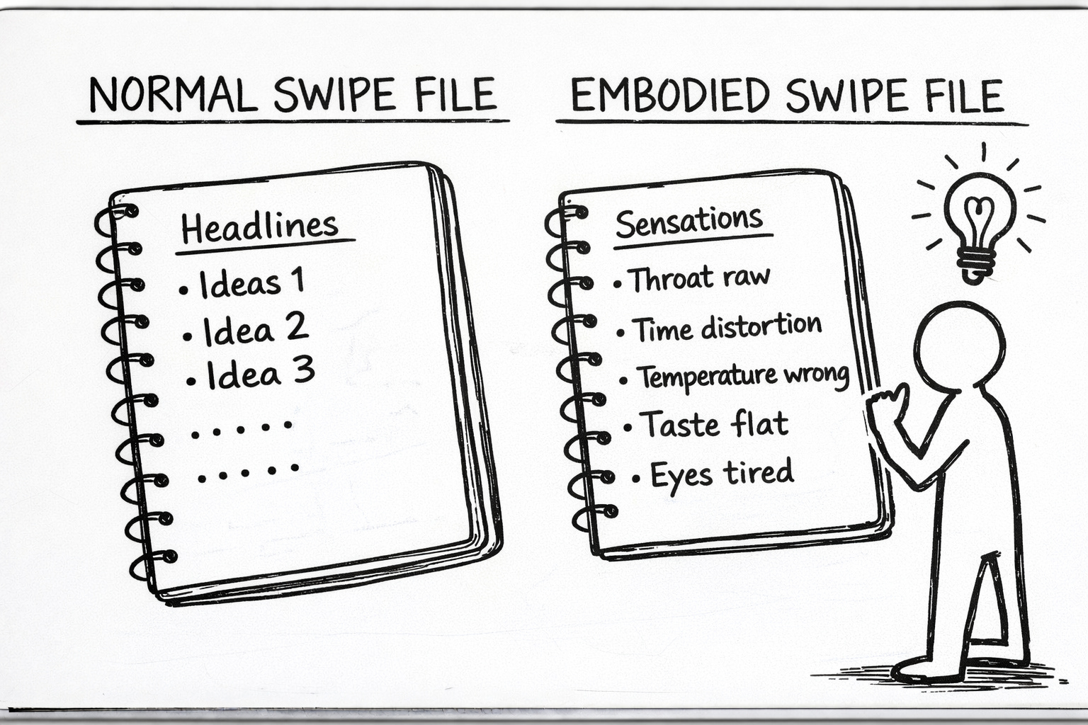 You need a different kind. An embodied swipe file captures sensations. Physical states. The stuff your body knows that your brain forgets to record.