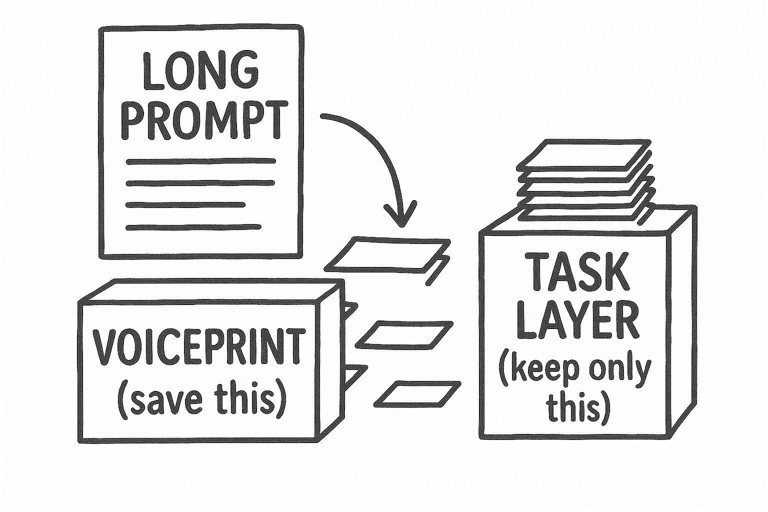 But when you make the actual request? That’s where minimalism wins. Don’t re-explain your voice in every prompt. Don’t stuff the task with competing constraints. The identity layer handles who you are. The task layer handles what you need right now.