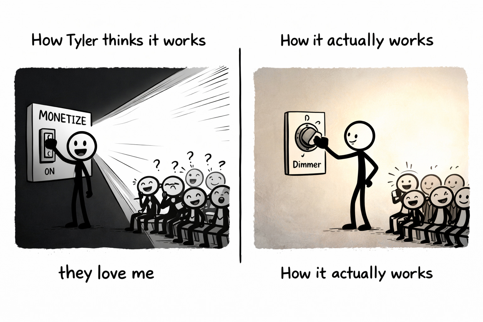He’d read the thread. Some newsletter guru with 40,000 subscribers said you should monetize early, while your audience is “most engaged.” Tyler had 247 free subscribers. An open rate hovering around 50%. Comments on most posts.
